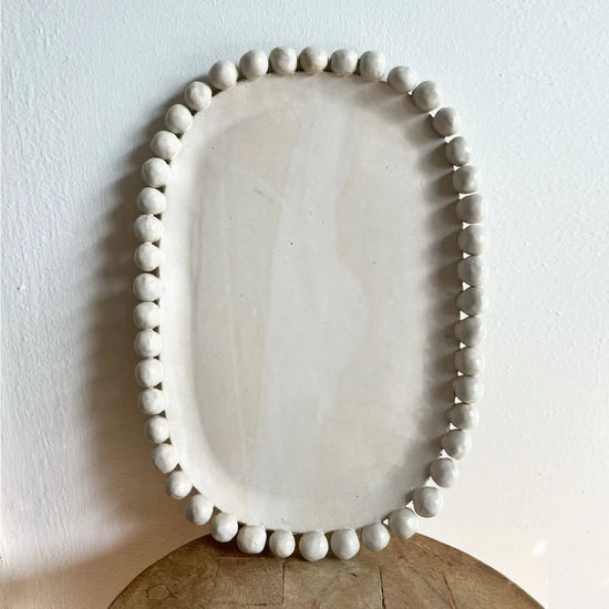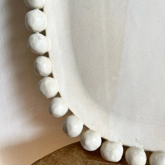 Generously sized platter with a dramatic beaded edge. Per uzshe, each one is handmade so there are variations in sizing of bobbles and glazing is perfectly imperfect.