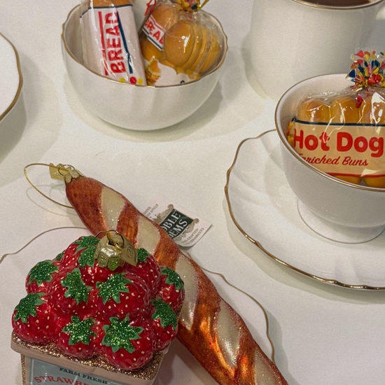 This Noble Gems™ glass French baguette ornament is a savory addition to your own décor! This ornament features a classic styled French baguette with a glossy look. The baguette has intricate details including the white flour along the sides and long middle cuts.